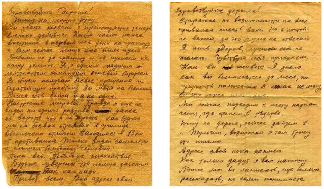 человеческих жизней. В тихое мирное утро 1941 фашистские войска атаковали СССР. Нацисты, двигаясь вперед, покорили уже Европу. Самонадеянные и одержимые, гитлеровцы рассчитывали на легкую добычу. Через полгода от Советского Союза должны были остаться только воспоминания. Но планы нацистов провалились, их встретили стойкость и непокорность русского народа, желание всеми силами одолеть лютого врага и спасти от фашизма не только свою Родину, но и весь мир. Война, как ты многолика! Война, ты говоришь на разных языках, ходишь по разным землям, но после себя всегда оставляешь одинаково глубокие раны, неиссякаемые реки горьких слез и ничем не заглушаемые стон и плач. Пережить войну не каждому под силу. Выдержать, выстоять, не сломаться и не сдаться, а самое главное - остаться человеком, сохранить свою душу, не утонуть в ненависти и злобе. Не зря говорят, что судьба человека - это река. А на войне она стремится, несётся и затягивает в кровавые круговороты, не оставляя выбора. Человек словно маленькая щепка в этой бездне. Его бросает от берега к берегу, и он так мал, чтобы повернуть реку вспять. Но целый народ - это огромная глыба, которая встала на пути фашистов. Тяжело досталась победа советским людям. В жестоких битвах против иноземных захватчиков они смогли отстоять родную землю, пропитав её своей кровью, прикрыв ее своими сыновними телами, обняв ее своими могучими и ласковыми руками, согрев ее своими пылкими сердцами. В памяти народной навсегда сохранятся имена героев-воинов, отдавших жизни делу защиты Родины. От того далёкого времени нас отделяет 65 лет, но до сих пор та война тревожит нас, ныне живущих, ведь она коснулась буквально каждого русского человека: нет семьи, из которой бы не ушёл воевать отец, брат, сын, дедушка.. Затронула та страшная война и мою семью: в ряды Советской армии на защиту Родины был призван мой прадедушка – Собкин Пётр Иванович. Рядовым солдатом он прошел всю войну, измерил необъятную Россию от края до края, гнал врага из Смоленска и Курска, Ленинграда и Сталинграда. «Ни шагу назад!» За плечами Родина, мама, жена и дети – все самое дорогое, ради чего стоит жить человеку. Ведь вернуться домой, припасть к родной земле, утереть слезы на глазах любимой, поклониться в пояс матери, прижать ребятишек к свой израненной груди - не это ли победа.. Но подолгу не прилетали весточки с фронта, затяжные шли бои, все больше похоронки, как черные вороны, стучали в соседские окна, но не уставала ждать и верить та, которая силой своей любви и верности согревала в холодной землянке, отводила от пули, прятала от лютой смерти. Навсегда остались в памяти у прабабушки Натальи Матвеевны и её детей те мучительные дни неизвестности, когда почтальон проходил мимо их дома. Вот поэтому письма прадедушки особо бережно хранятся в нашей семье. Это - наша реликвия. Удивительным теплом, нежностью пропитана каждая строчка послания. В этих письмах совсем нет страха, робости. Напротив, они полны решимости, смелости, отваги. Сегодня эти письма пожелтели, но от этого стали только дороже нам. Мой прадедушка прошёл всю войну. Он бесстрашно, мужественно бился с фашистами за свободу советского народа. В одном из боёв под Сталинградом прадедушка потерял ногу, но остался жив. 200 дней и ночей стояли насмерть советские солдаты, не уступая врагу ни пяди земли сталинградской. 